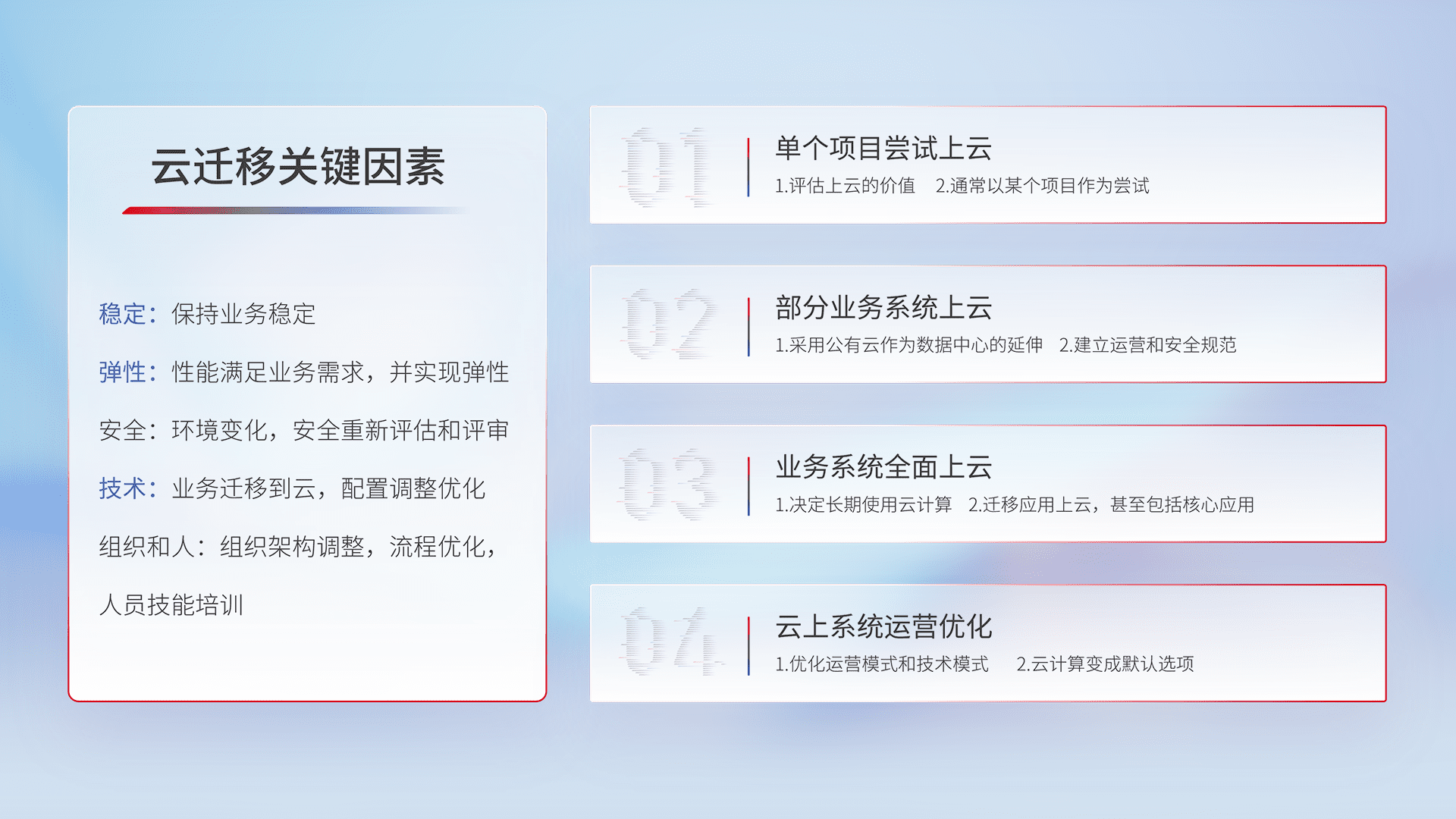结合实际业务,,,,从规划设计、、云平台选型、、云原生改造、、、数据迁移、、、、集成交付,,迁移全过程为客户识别最佳上云路径,,,,做好风险识别管理,,设计网络架构、、、、身份权限、、、、安全审计合规、、操作审计、、、日志审计、、、监控告警策略、、多站点容灾设计等,,,对云上基础设施进行整体规划,,,,提升IT治理水平,,,,以满足弹性、、、高可用、、、高性能的需求。。。