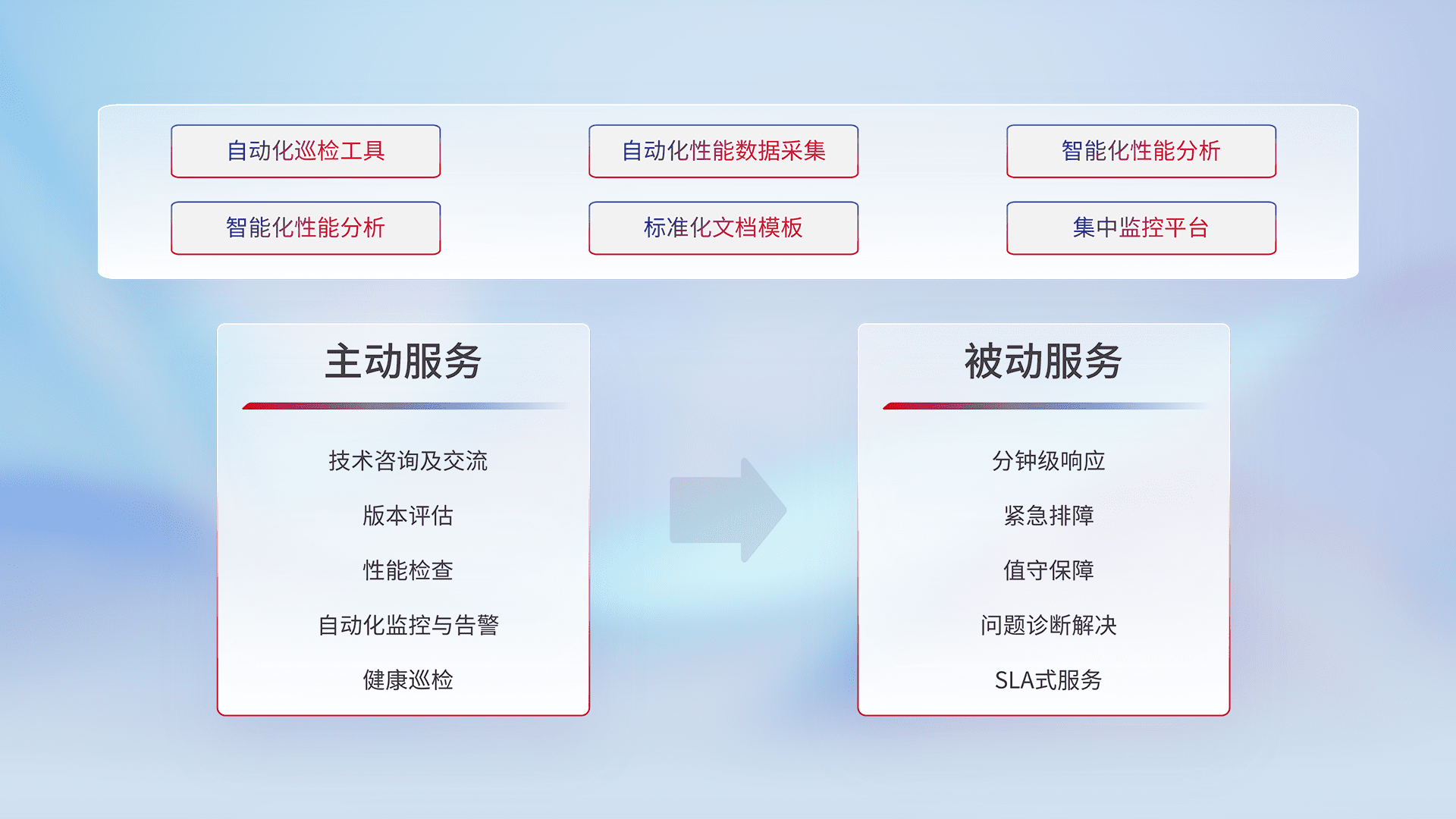 智能化工具和标准化文档,,,,保障服务质量,,,提供主动服务(包含技术咨询、、、版本评估、、性能检查、、、、自动化监控与告警、、、、健康巡检)和被动服务包含(分钟级响应、、紧急排障、、、值守保障、、、问题诊断解决、、、SLA服务)。。。