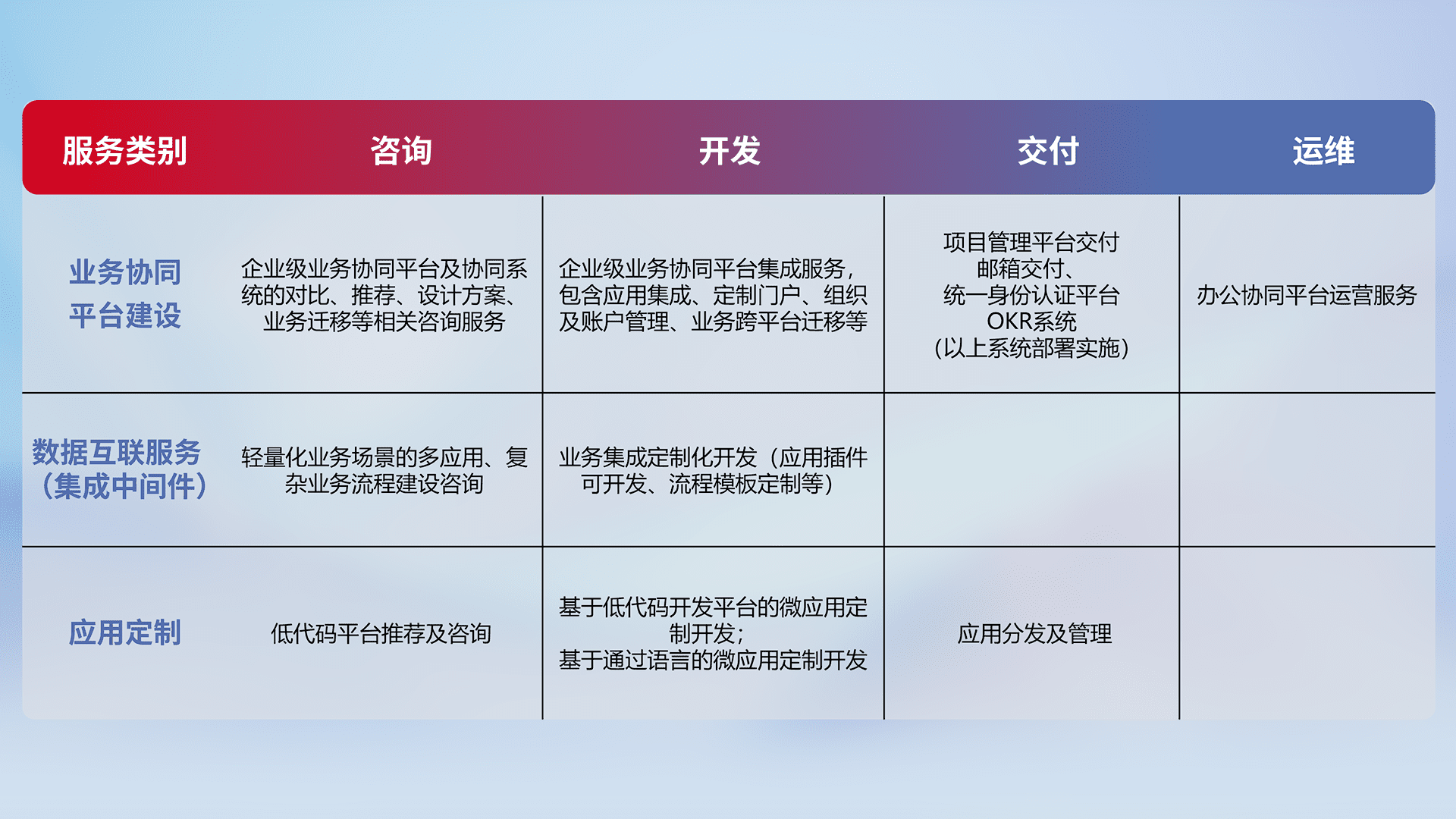 针对钉钉、、、企微、、IDaas等平台级产品提供产品的规划、、、方案、、、交付、、定制化开发等服务,,,实现如统一协同办公、、、智能客户服务、、、、混合会议管理、、、智能数据查询、、、等业务场景,,,实现数字化转型。。